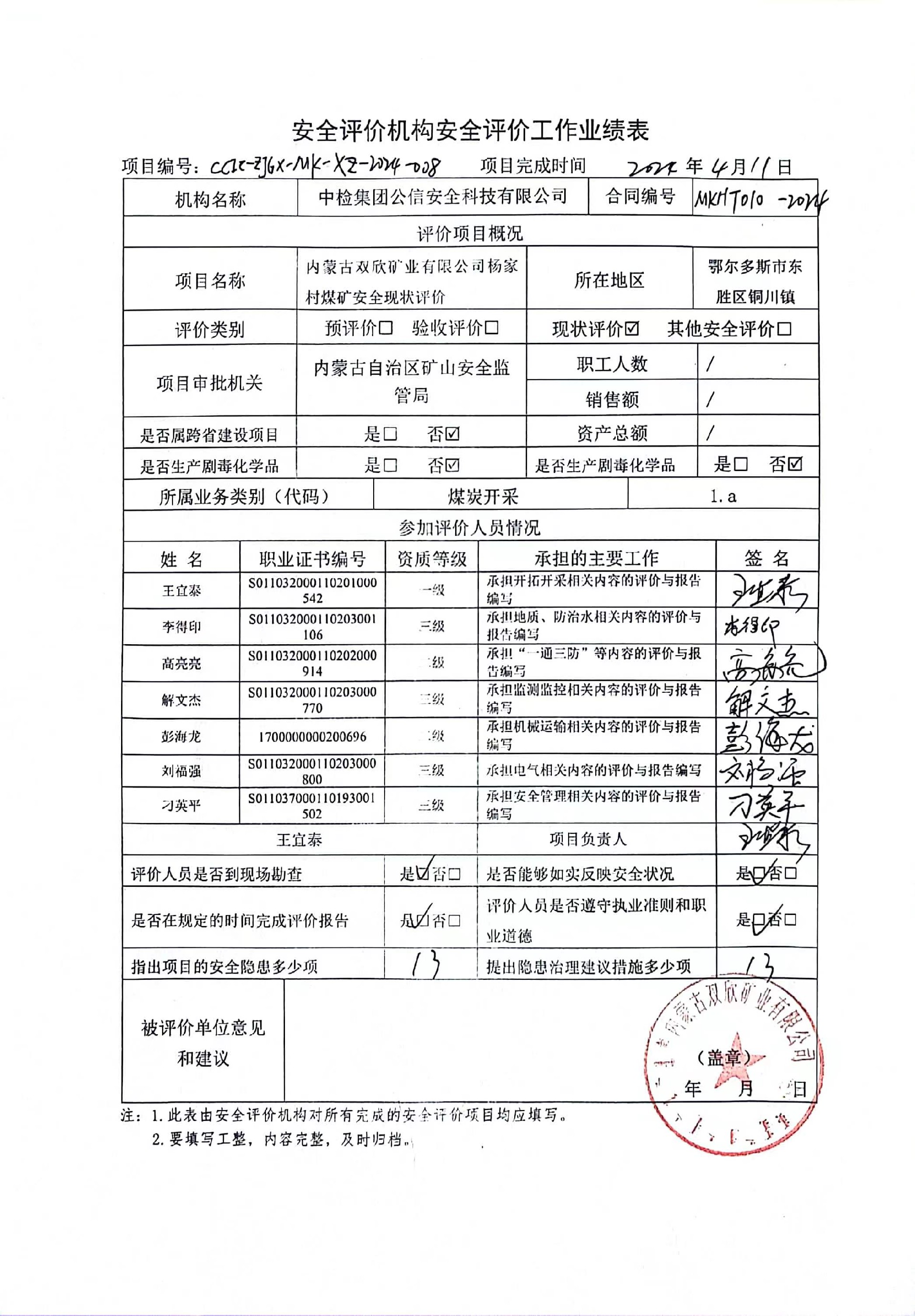 評(píng)價(jià)項(xiàng)目名稱 | 內(nèi)蒙古雙欣礦業(yè)有限公司楊家村煤礦安全現(xiàn)狀評(píng)價(jià)報(bào)告 | ||||||