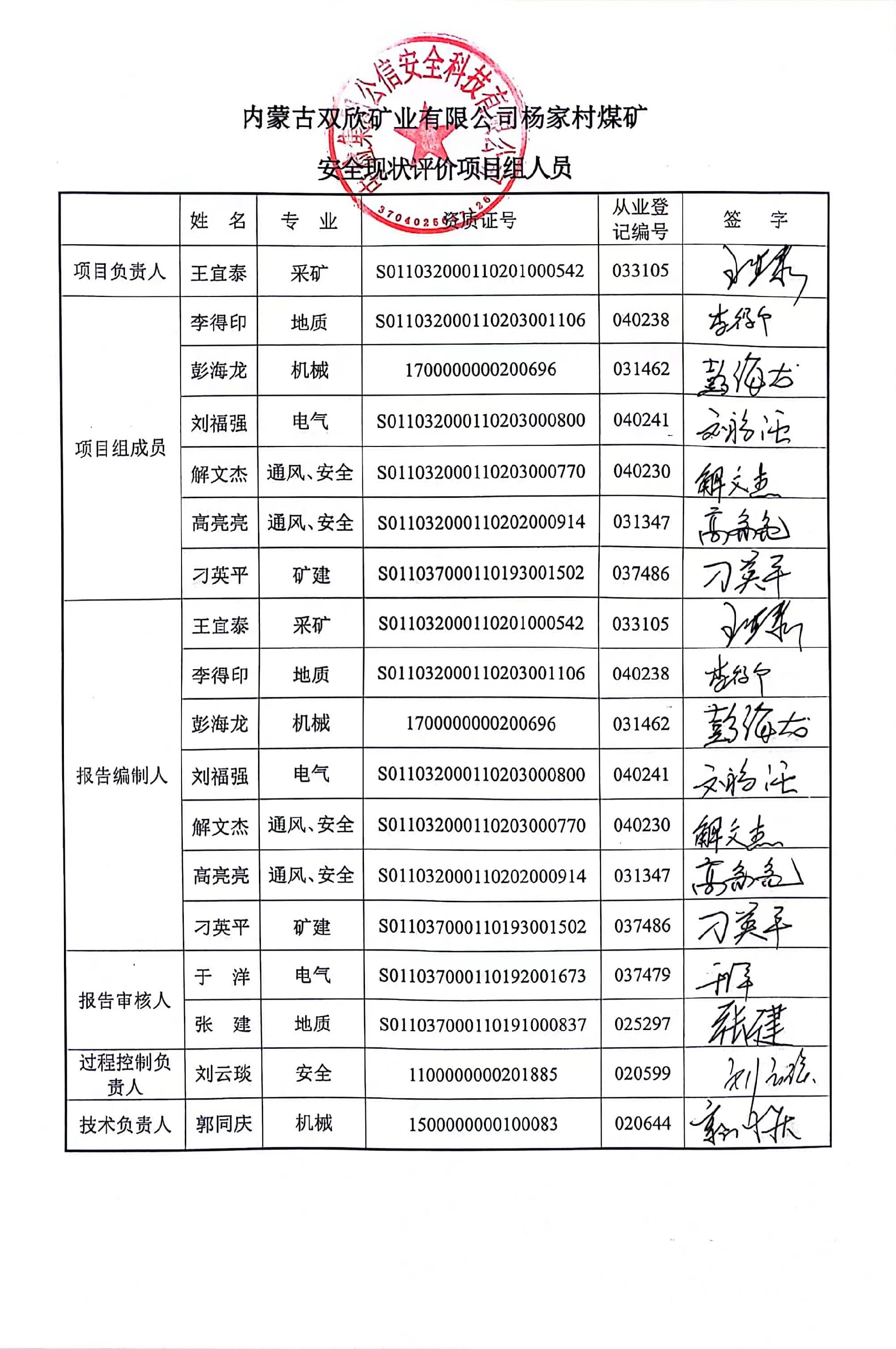 參與安全評(píng)價(jià)工作的注冊(cè)安全工程師: 王宜泰、高亮亮、彭海龍 | |||||||