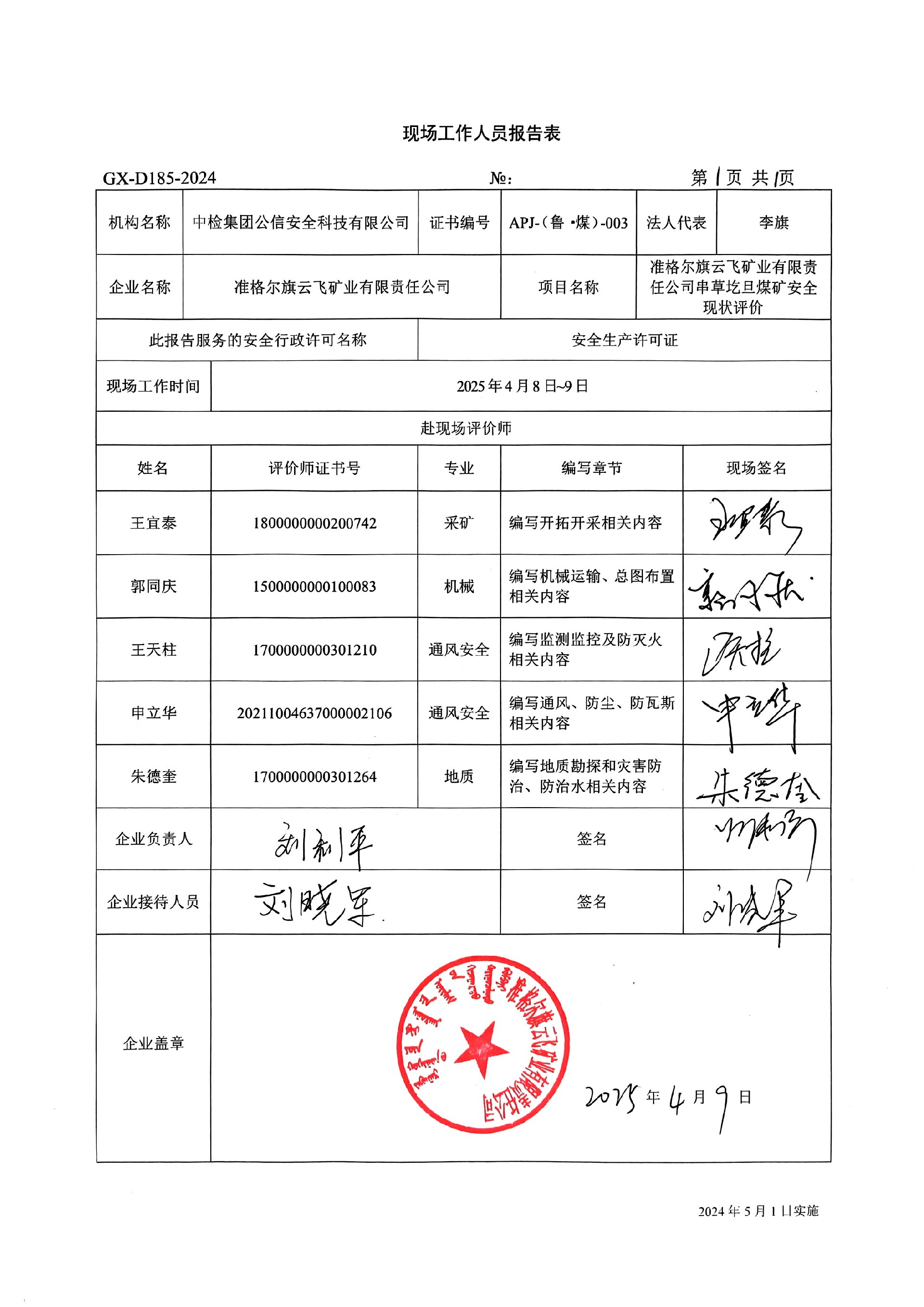 到現場開展安全評價工作的人員、時間及主要任務: 人員:王宜泰、郭同慶、王天柱、朱德奎、申立華 時間、任務: 評價項目組于2025年4月8日~9日到現場調查、檢查;2025年4月15日編寫修改完善報告。 | ||||||