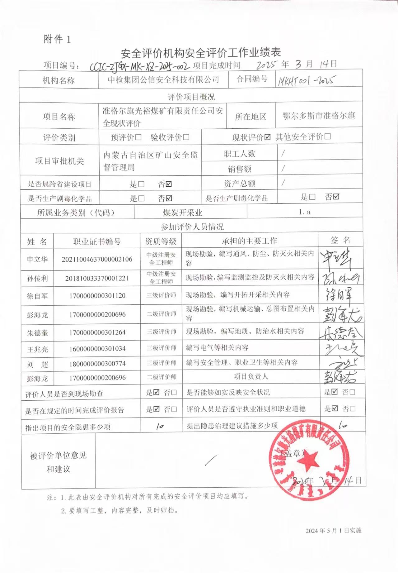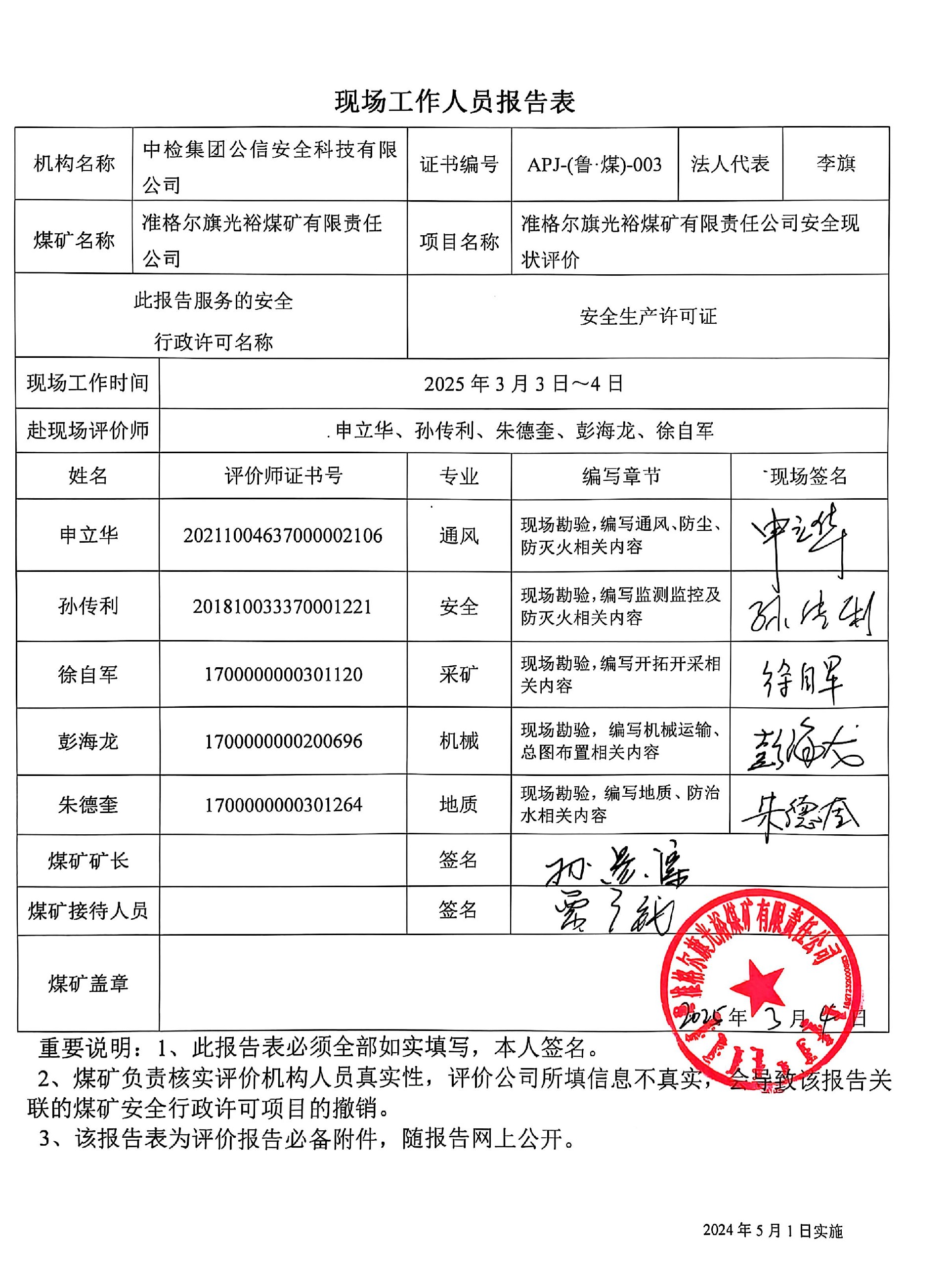 現(xiàn)場開展安全評價工作的人員、時間及主要任務: 孫傳利、徐自軍、申立華、朱德奎、彭海龍2025年3月3日~4日到現(xiàn)場進行調(diào)查、搜集資料,進行現(xiàn)場評價。 | |||||||