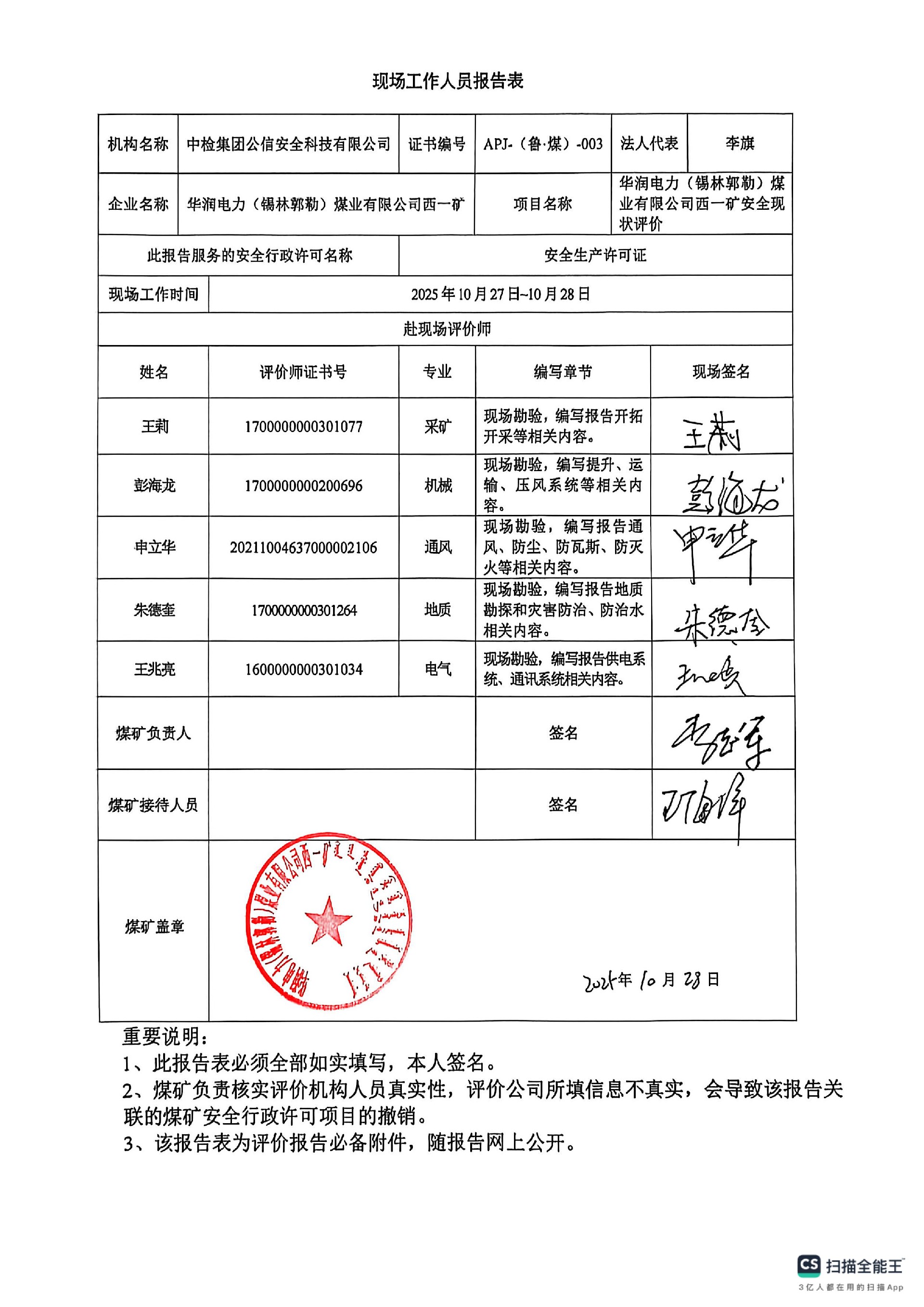 現(xiàn)場開展安全評價工作的人員、時間及主要任務: 彭海龍 申立華 朱德奎 王莉 王兆亮于2025年10月27~28日到現(xiàn)場進行調(diào)查、搜集資料,進行現(xiàn)場評價。 彭海龍 朱德奎于2025年10月31日對現(xiàn)場問題進行復查,礦方均已整改合格。 彭海龍 王莉 申立華 王天柱 朱德奎 王兆亮 劉超對報告進行了編寫。 |