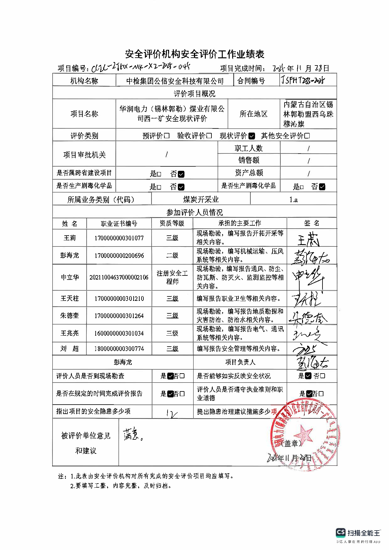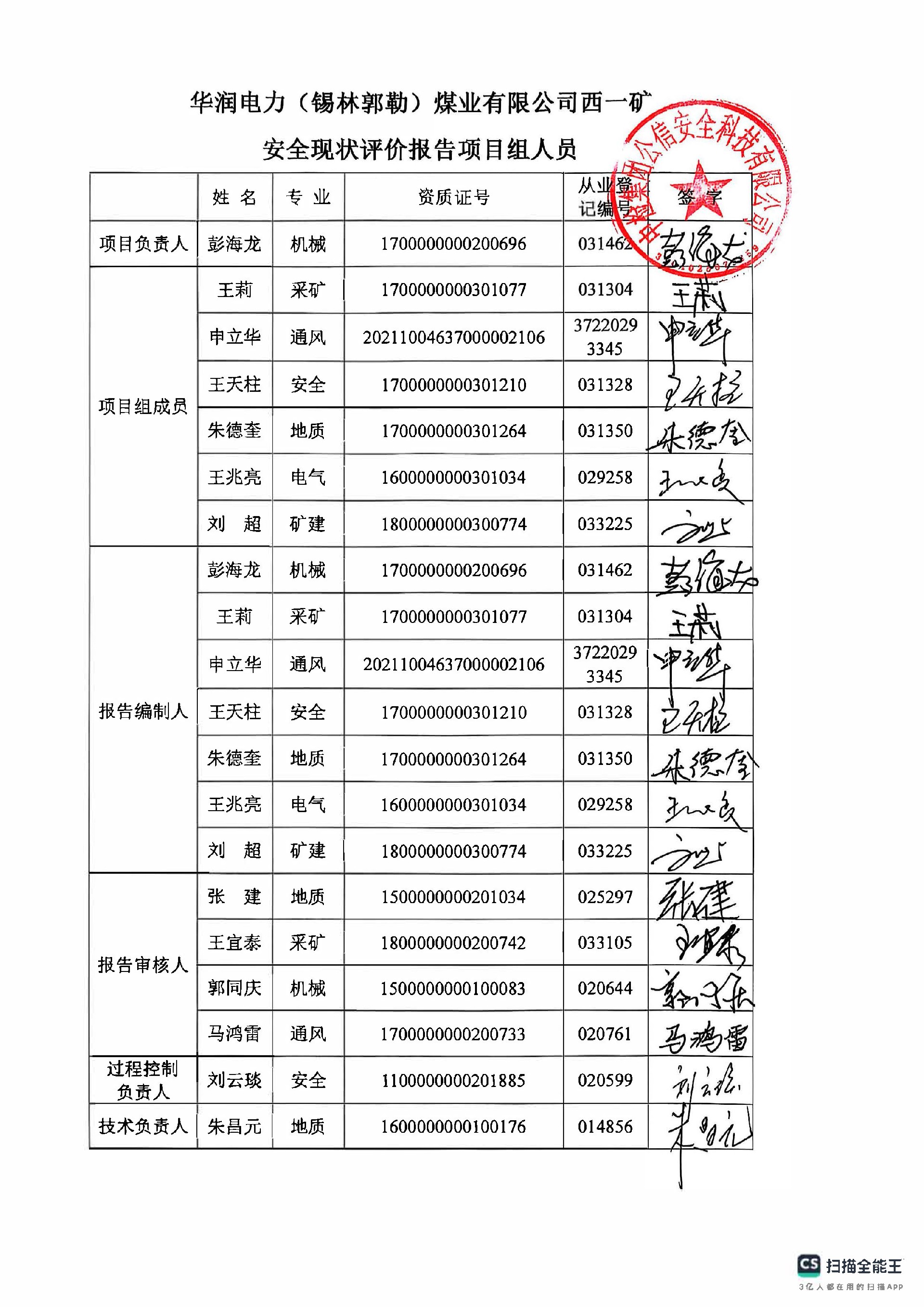 參與安全評價工作的安全評價師: 彭海龍 王莉 王天柱 朱德奎 王兆亮 劉超 |