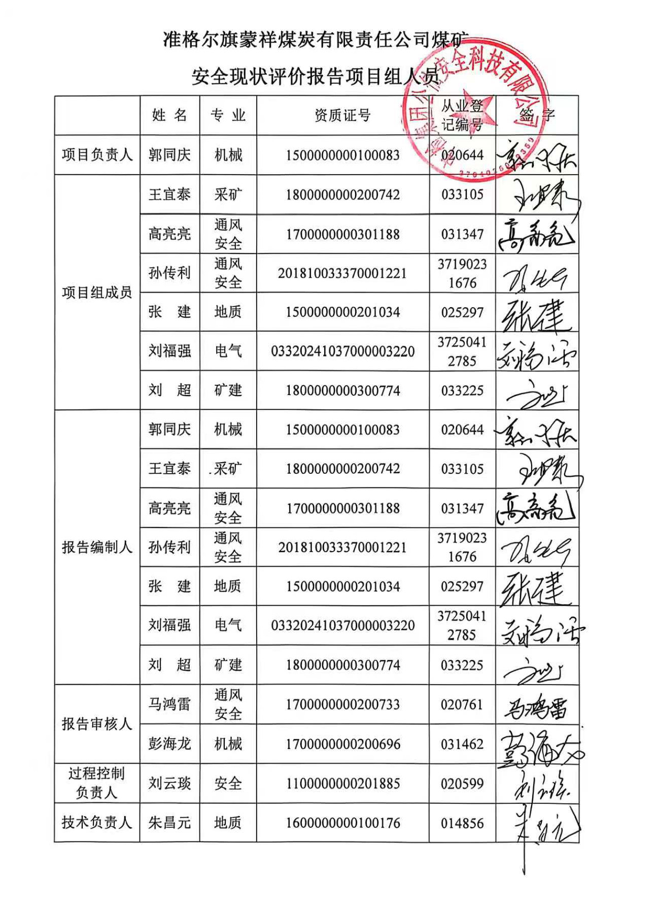 參與安全評價(jià)工作的安全評價(jià)師: 王宜泰、張建、郭同慶、劉超、高亮亮 | |||||||