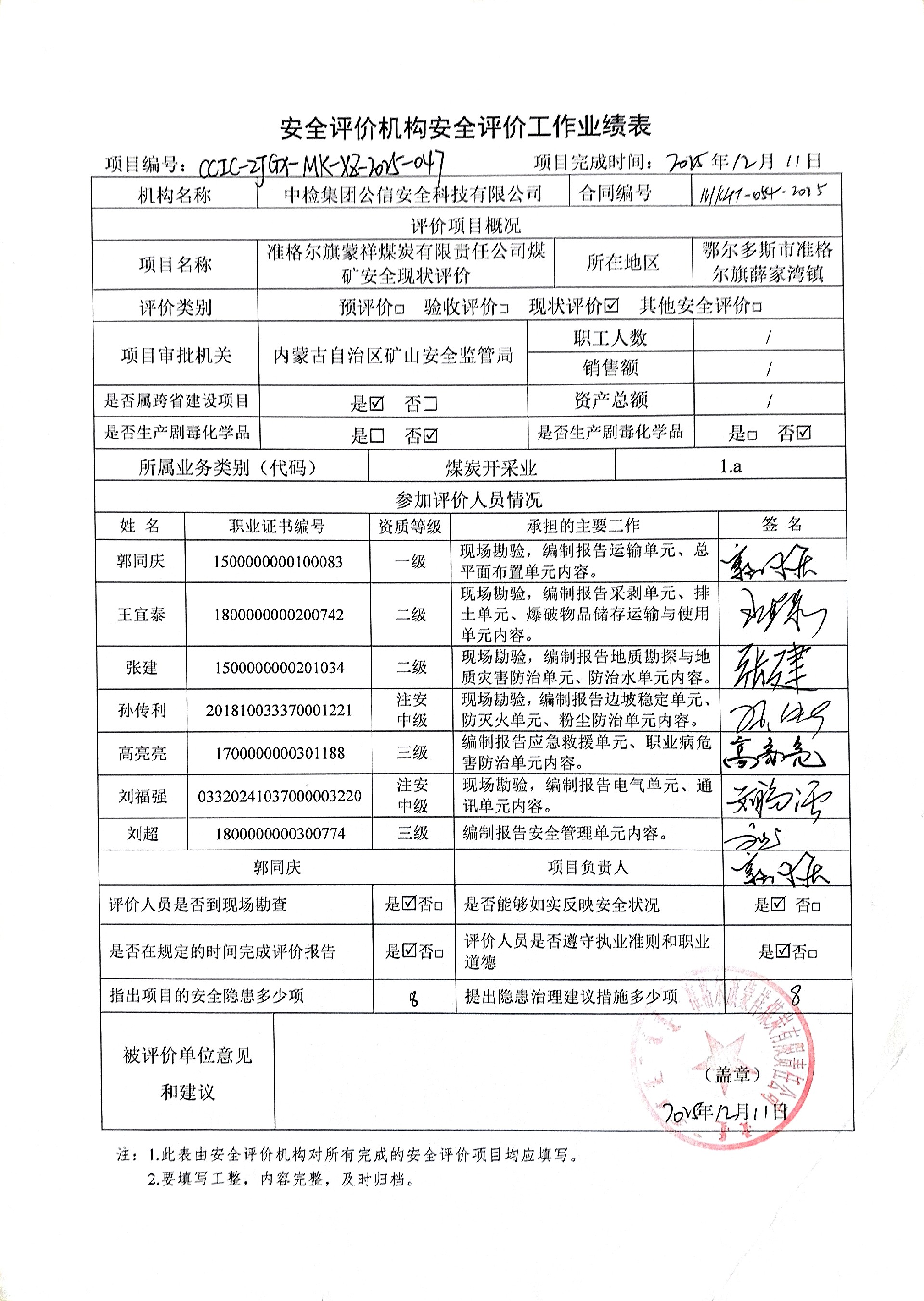 評價(jià)項(xiàng)目名稱 | 準(zhǔn)格爾旗蒙祥煤炭有限責(zé)任公司煤礦安全現(xiàn)狀評價(jià)報(bào)告 | ||||||