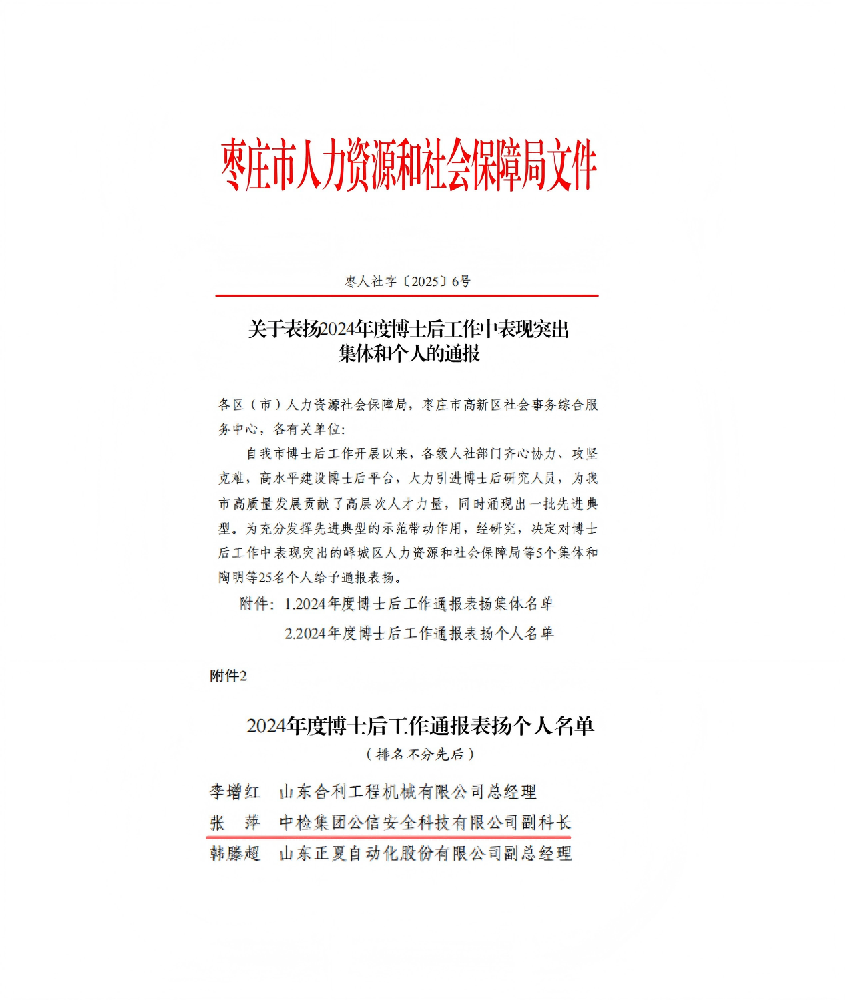 近日,棗莊市人力資源和社會保障局印發(fā)《關(guān)于表揚(yáng)2024年度博士后工作中表現(xiàn)突出集體和個人的通報(bào)》,中檢集團(tuán)公信安全科技有限公司(簡稱“中檢公信”或“公司”)人力資源部張萍名列其中,榮獲···