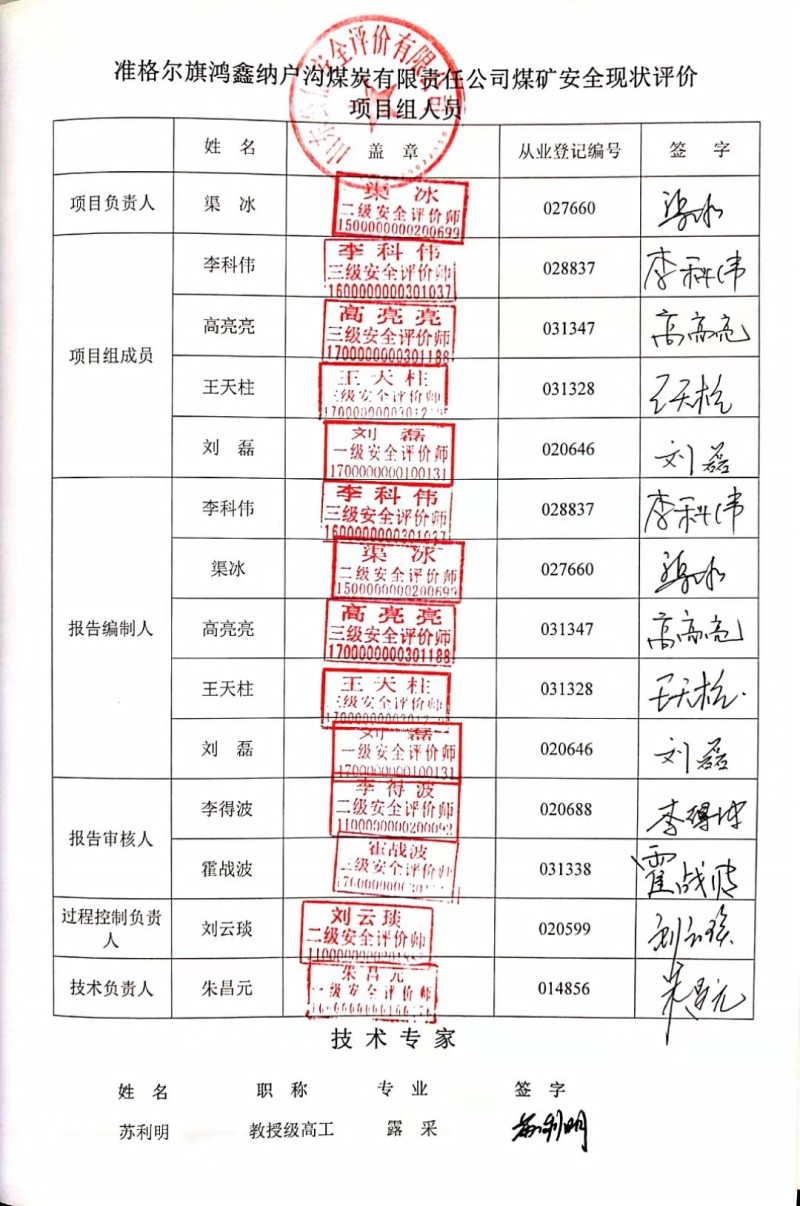 | 參與安全評價工作的注冊安全工程師: 渠冰、劉磊、高亮亮 |