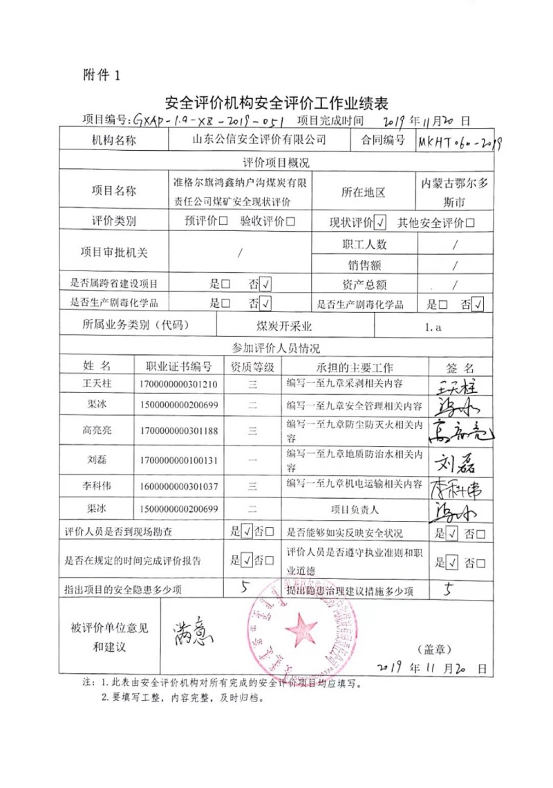 | 評價項目名稱 | 準格爾旗鴻鑫納戶溝煤炭有限責任公司煤礦安全現(xiàn)狀評價報告 | ||||||